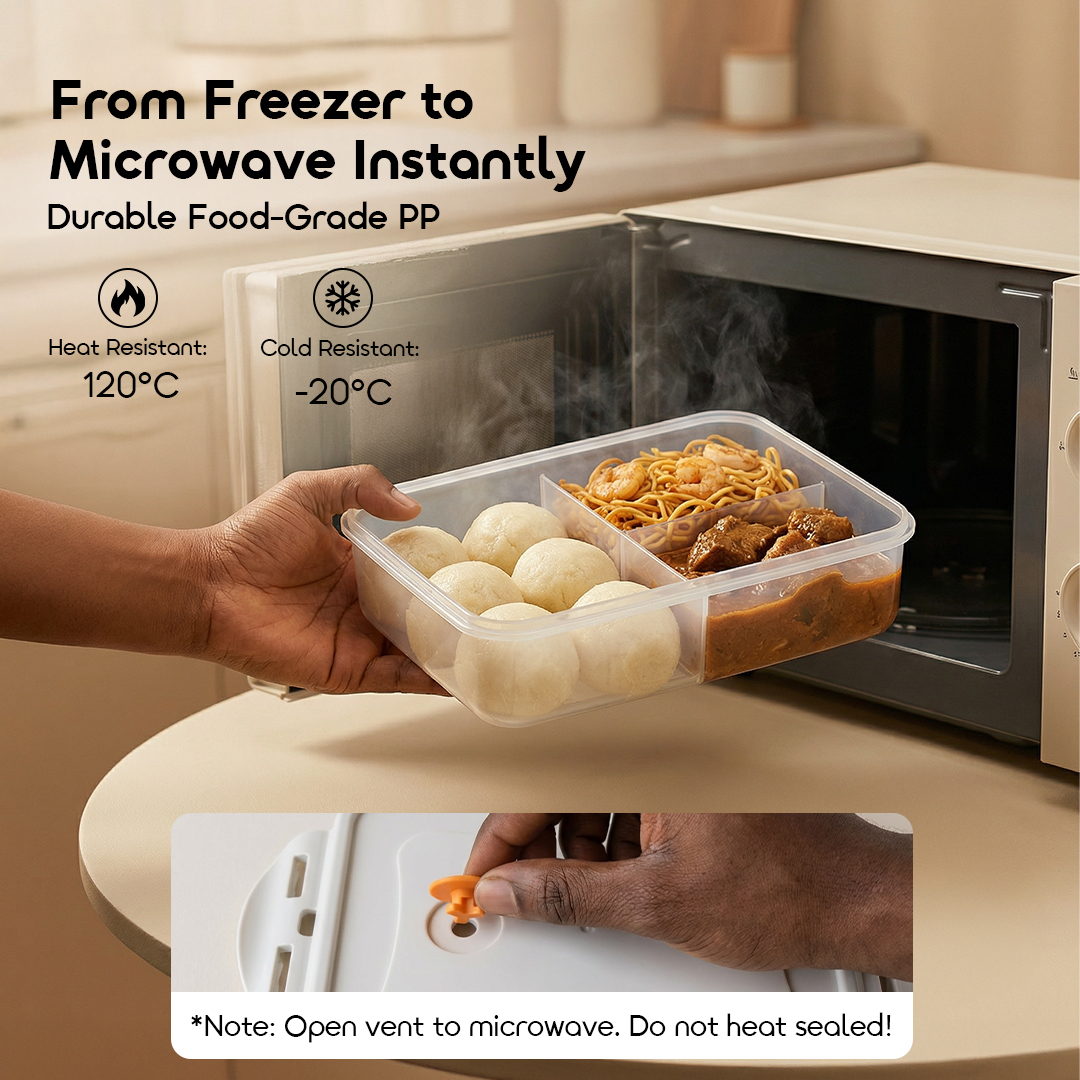 Made from premium food-grade PP material, this box withstands temperatures from -20°C to 120°C.